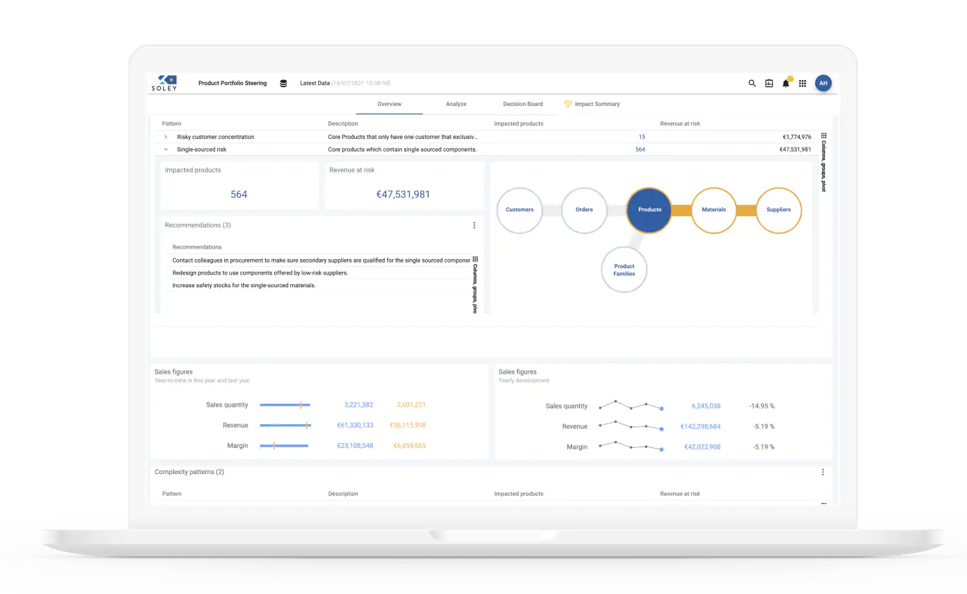 That is why Soley combines various software modules and thus directly addresses the core of a company: the product. By means of comprehensive dependency analyses and impact assessments, organizations gain a comprehensive overview of potentials, dependencies and risks within their product portfolio. In this way, complex interrelationships and dependencies can be illuminated at any time and companies gain direct action-relevant insights that are a prerequisite for successful business decisions. Learn more about the product mining platform from Soley.